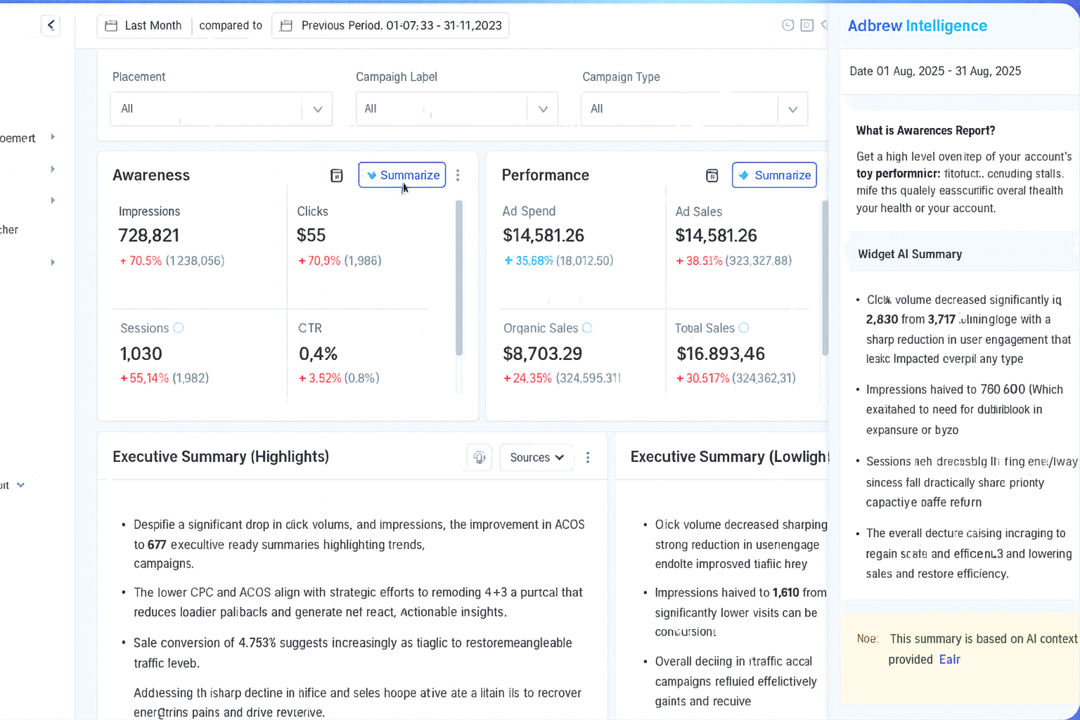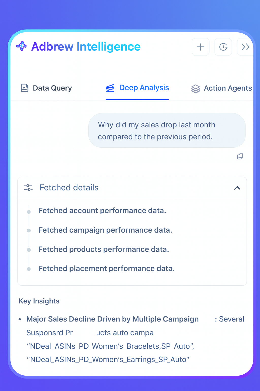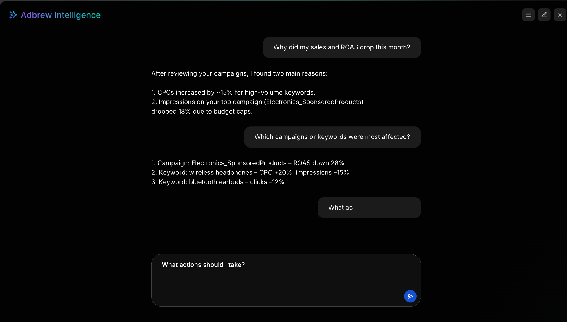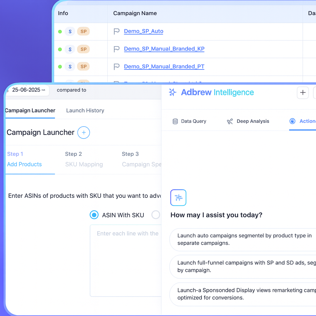 AI excels at processing complex data, identifying trends, and optimizing bids or keywords in real time. Tools like Adbrew Intelligence take this further by turning raw data into clear dashboard insights and allowing you to take manual bulk actions through simple prompts. Instead of spending hours analyzing reports, you can ask Adbrew Intelligence questions like “show me underperforming campaigns” and instantly act on the results.